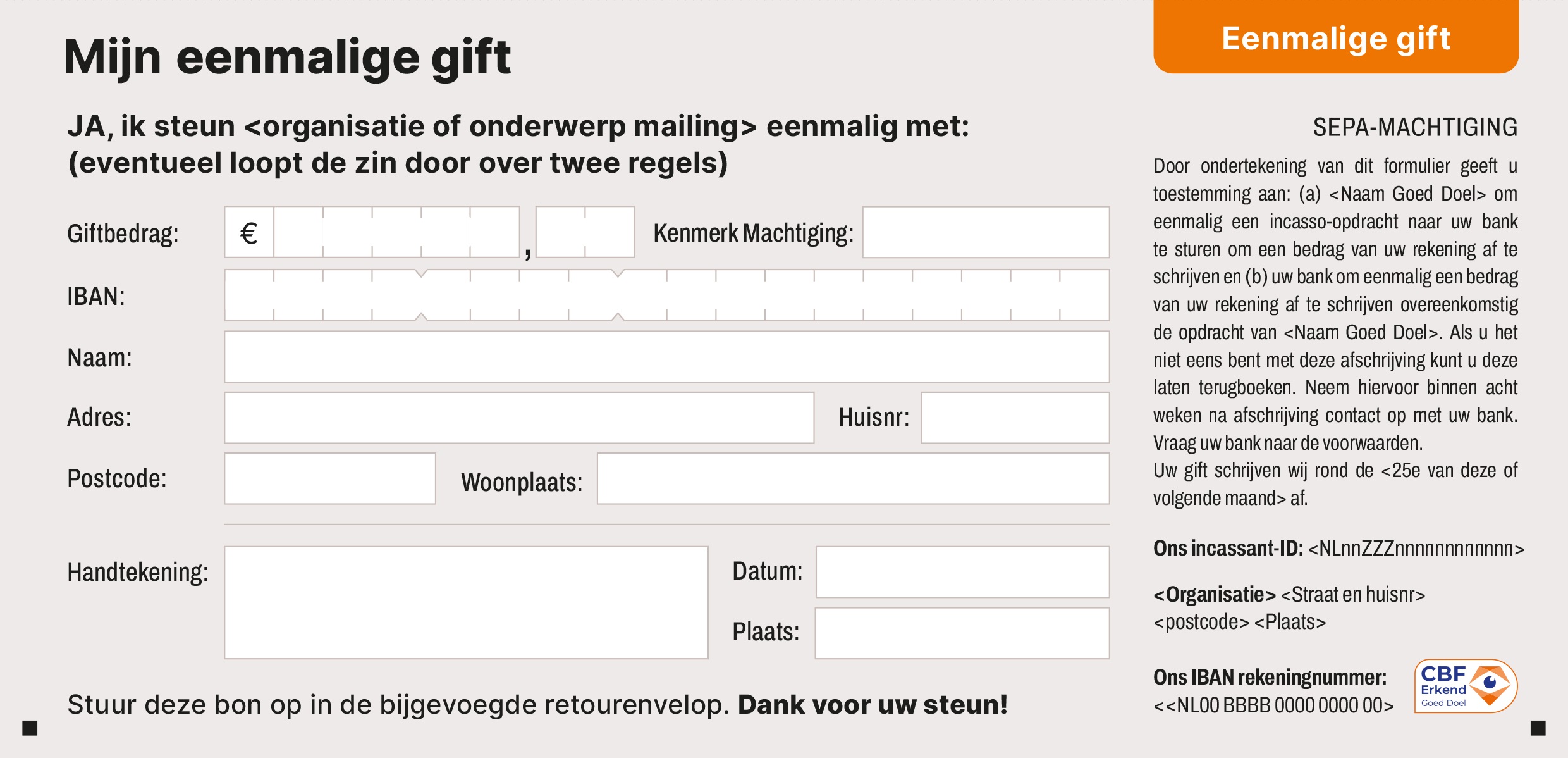 Heel eenvoudig. Vul Mijn eenmalige gift in op dezelfde manier als de Acceptgiro. Stuur deze dan niet aan de bank, maar naar ons in de bijgeleverde retourenvelop. Je kunt Mijn eenmalige gift op twee manieren gebruiken: