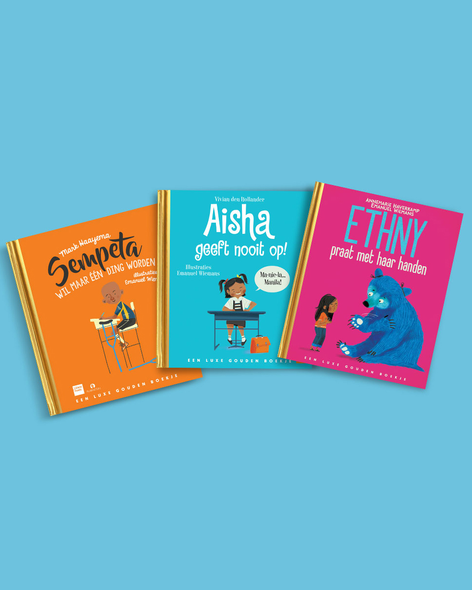 Kinderen met een handicap spelen zelden de hoofdrol in kinderliteratuur. Dat vinden we een gemiste kans voor kinderen met én voor kinderen zonder handicap. Daarom zijn er naast het boekje over Ethny nog twee titels verkrijgbaar: ‘Aisha geeft nooit op!’ en ‘Sempeta wil maar één ding worden …’ .