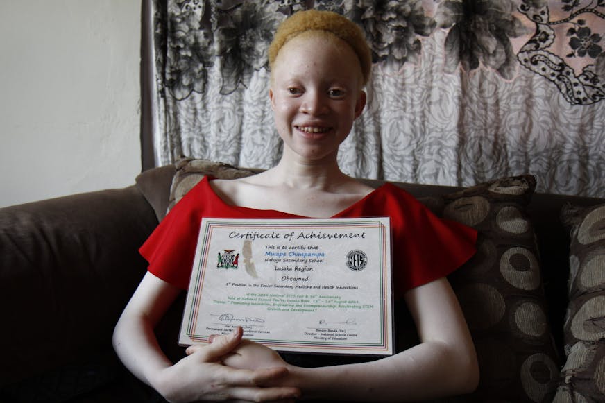 Als zonnebrandcrème mensen met albinisme letterlijk in leven houdt, maar velen het niet kunnen betalen, wat dan? “Dan maak ik het zelf”, dacht Mwape (14) uit Zambia. Ze heeft albinisme en verbaasde iedereen met de prijs die ze ervoor ontving.